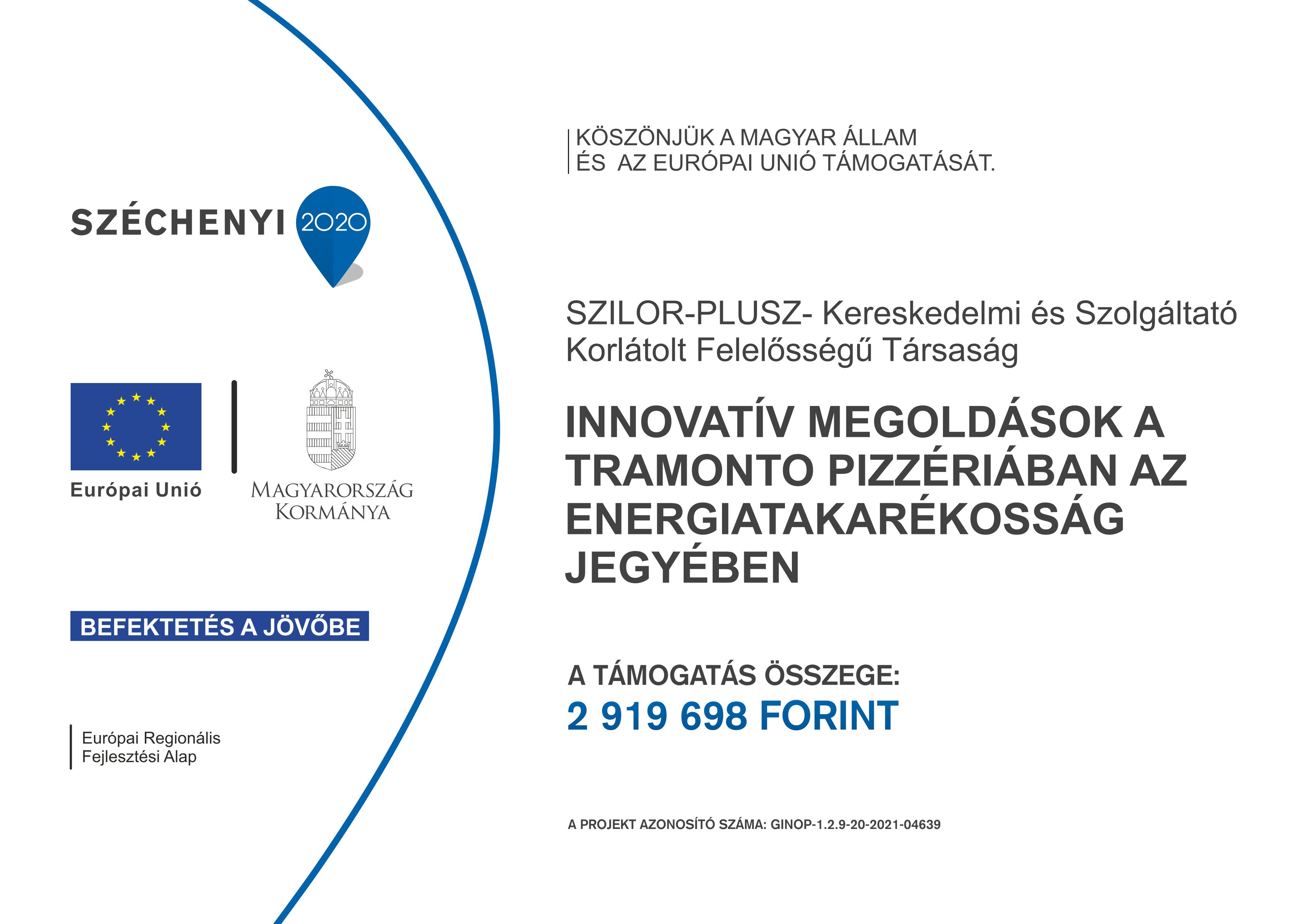 Örömmel tájékoztatunk mindenkit, hogy a Gazdaságfejlesztési és Innovációs Operatív Programhoz a Szilor-Plusz kft által benyújtott "Innovatív megoldások a Tramonto Pizzériában az energiatakarékosság jegyében" című Ginop 1.2. 9. 20-2021-04639 számú felhívásra beadott pályázatunkat a Gazdaságfejlesztési Programok Irányító Hatóságának vezetője támogatásra érdemesnek találta. 70 %-os támogatási intenzitás mellett a részünkre megítélt támogatás összege: 2 919 698 Ft.